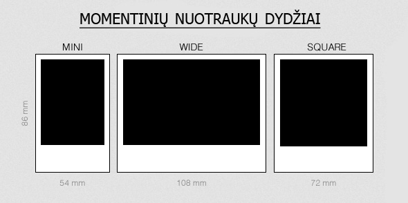 Į momentinius fotoaparatus dedasi fotoplokštelių (nuotraukų) kasetės su 10 nuotraukų. Mini, Wide ir Square fotoaparatai skiriasi nuotraukų dydžiu. Nuotraukų dydžių palyginimas: